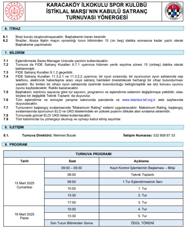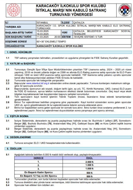 Okulumuz Çatalca Karacaköy İlk Ve Ortaokulu Spor Kulübü tarafından, Okul Aile Birliğimizin katkılarıyla 15.03.2025 - 16.03.2025 tarihlerinde İstiklal Marşı'mızın kabulü adına satranç turnuvası düzenlenecektir.